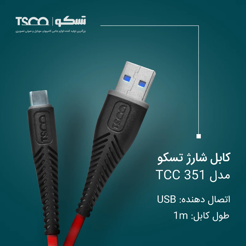 کابل تبدیل USB به TYPE-C برند تسکو 1 متر طول دارد و رشتههای مسی آن با استفاده از روکشی بافتهشده پوشانده شدهاند. این روکش مقاومت زیادی دارد و رشتههای مسی داخل کابل را در برابر قطعشدن براثر کشیدن ، خم شدن و گره خوردن مقاوم کرده است؛ کانکتورهای به کاررفته در کابل شارژ تسکو مدل TCC 351 بسیار مقاوم هستند. در یک سمت این کابل یک کانکتور TYPE-C و در سمت دیگر آن یک کانکتور USB وجود دارد.